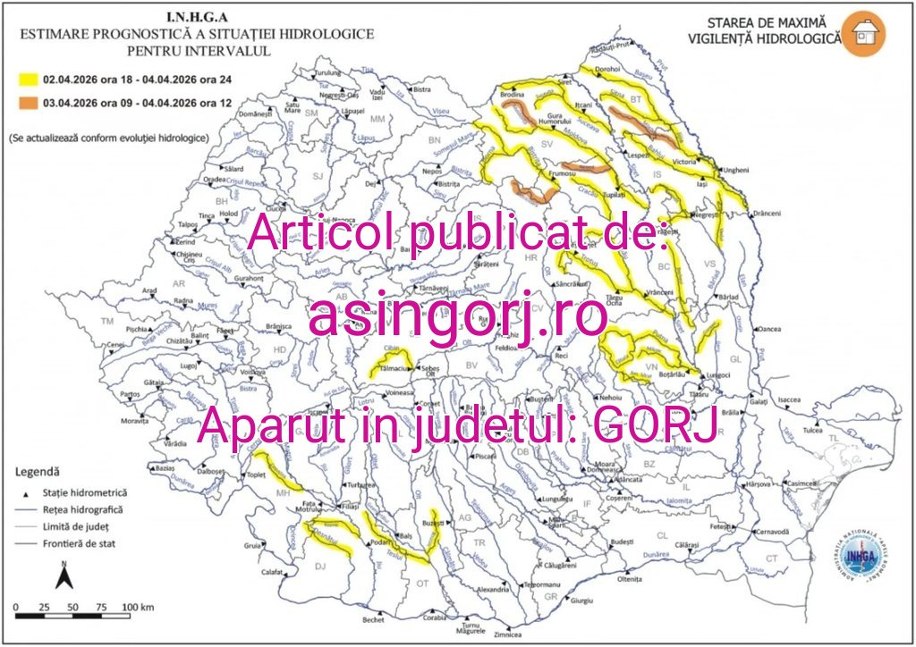 Meteorologii au emis cod galben de inundații, în intervalul 2 aprilie, ora 18:00 – 4 aprilie, ora 24:00.