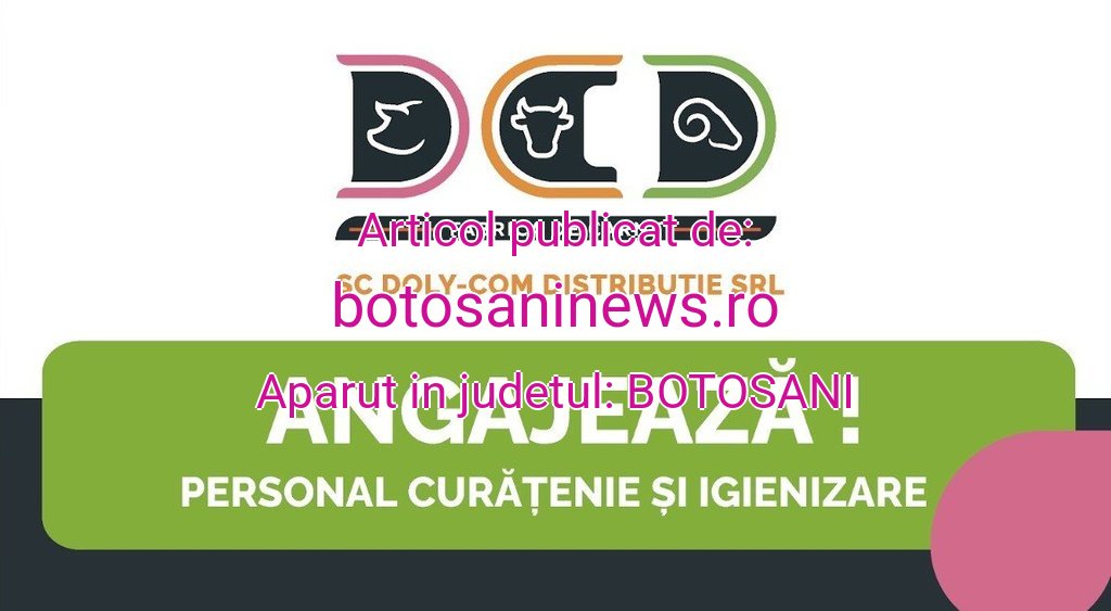 Doly- Com Distribuție Botoșani caută personal pentru curățenie și igienizare. În echipa noastră vei fi responsabilă de menţinerea curăţeniei si igienei, utilizând soluţii profesionale de curătenie si dezinfectare pe toate suprafetele. Te așteptăm în echipa noastră dacă ai o atitudine pozitivă şi îti place să contribui la menţinerea ordinii si igienei. Experienţa în domeniul curăţeniei reprezintă un avantaj, dar nu este obliaatorie. CV-urile/ cererile se pot depune la Compartimentul R.U. sau se pot trimite pe e-mail la adresa:Relatii la tel: 0757 494 882/0231 565 970
