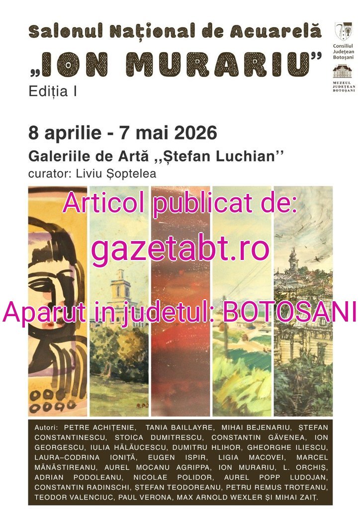Muzeul Județean Botoșani, prin Secția de Artă Plastică, Etnografie și Științele Naturii, organizează, în spațiul Galeriilor de Artă ,,Ștefan Luchianˮ Botoșani, evenimentul expozițional denumit Salonul Național de Acuarelă ,,Ion Murariuˮ- ediția I, care se va desfășura în perioada 8 aprilie – 7 mai 2026.