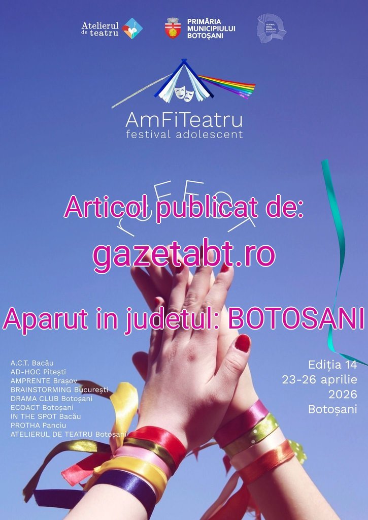 Între 23 și 26 aprilie, Botoșani devine locul unde teatrul adolescent prinde viață. Festivalul AmFiTeatru ajunge la ediția a 14-a și aduce împreună peste 120 de elevi-actori din toata țara. A.C.T. Bacău, Ad-Hoc Pitești, Amprente Brașov, Brainstorming București, Drama Club Botoșani, EcoAct Botoșani, In The Spot Bacău, Protha Panciu și Atelierul de teatru sunt trupele care vor juca anul acesta pe scena AmFiTeatru.