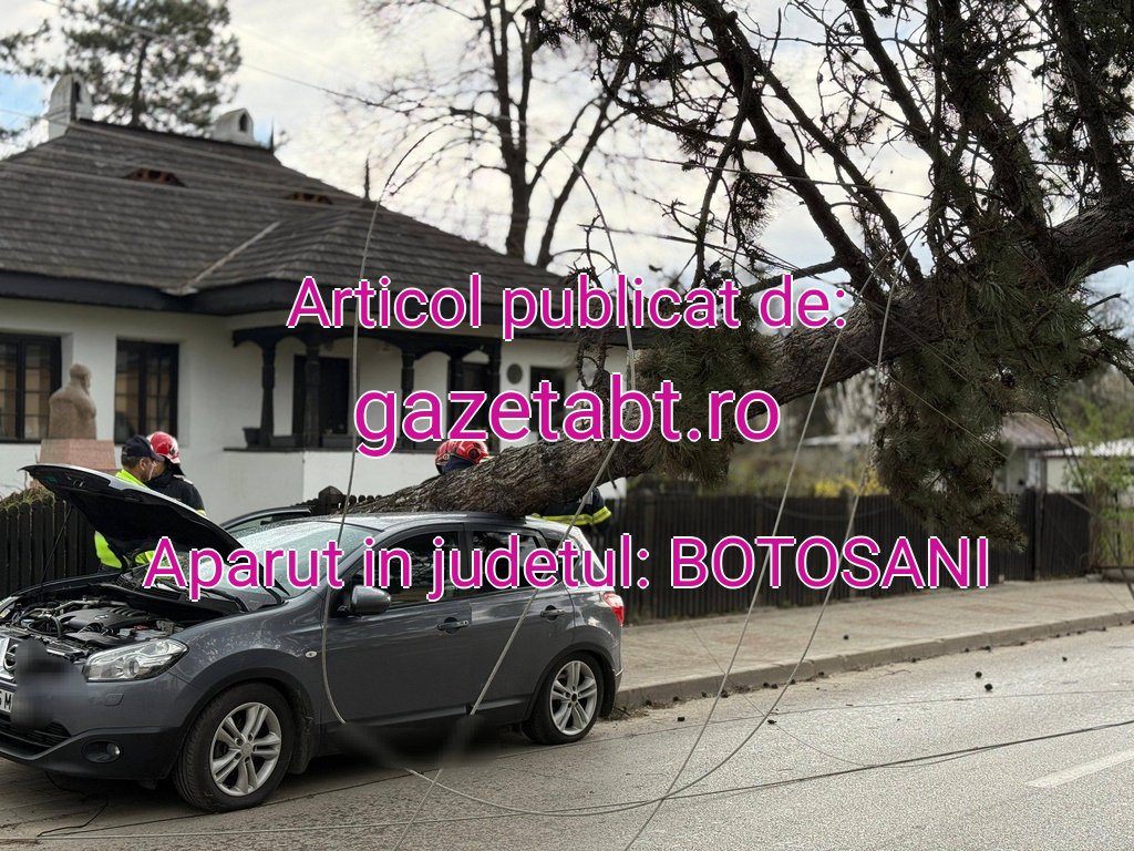 Pompierii militari și voluntari au intervenit, astăzi, pe strada Nicolae Iorga din municipiul Botoșani, unde un copac și doi stâlpi de electricitate au fost doborâți de vânt.