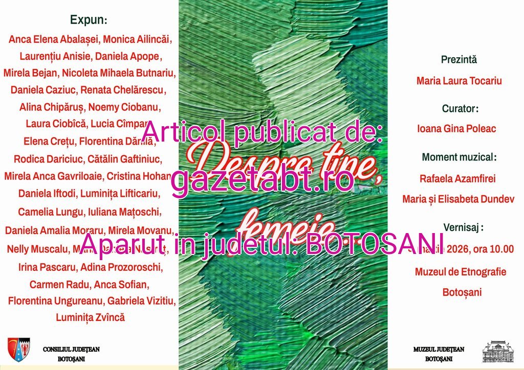 Muzeul Județean Botoșani organizează la Muzeul de Etnografie, în perioada 6-10 martie 2026, expoziția de artă plastică intitulată „Despre tine, femeie…”.