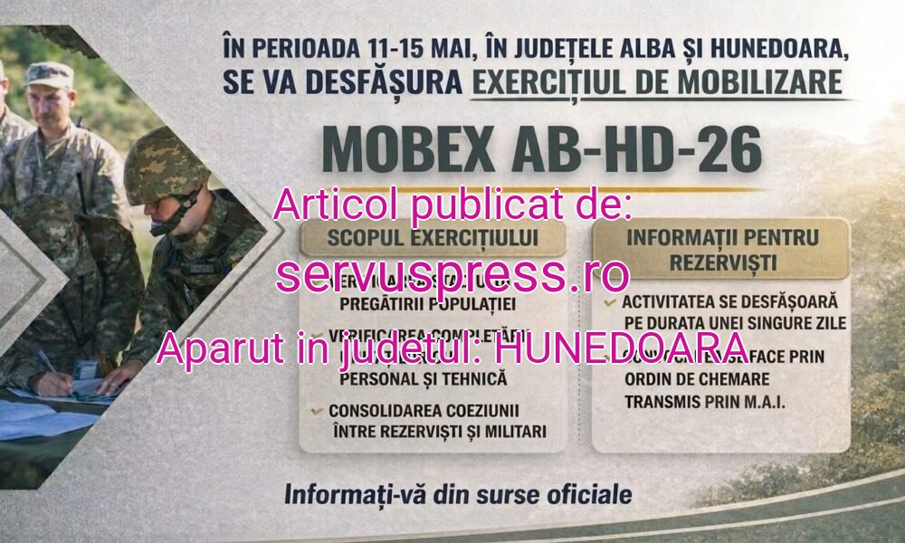 Ministerul Apărării Naționale (MApN) anunță că, î n perioada 11- 15 mai, în judeţele Alba şi Hunedoara, se va desfăşura primul exerciţiu din acest an pentru verificarea stadiului pregătirii populaţiei, economiei şi teritoriului pentru apărare.Este vorba despre exercițiul “MOBEX AB-HD-26”.