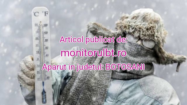 Meteorologii au actualizat prognoza și au prelungit Codul Galben de ger pentru județul Botoșani, până luni, la ora 10:00. Temperaturile minime se vor situa între minus 20 și minus 9 grade, cu ger persistent și peste zi.
