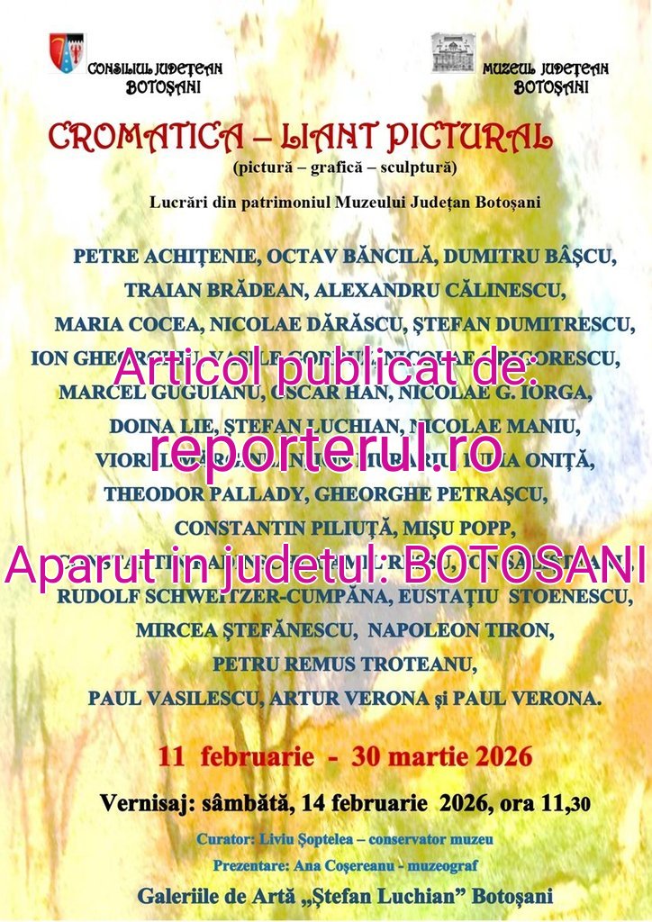 Muzeul Județean Botoșani, prin Secția Artă Plastică – Etnografie – Științele Naturii, organizează în perioada 11 februarie – 30 martie 2026, în spațiul Galeriilor de Artă „Ștefan Luchian”, expoziția „Cromatica – liant pictural”. Aceasta reunește lucrări de pictură, grafică și sculptură aflate în patrimoniul Muzeului Județean Botoșani, unele expuse în premieră la Botoșani.