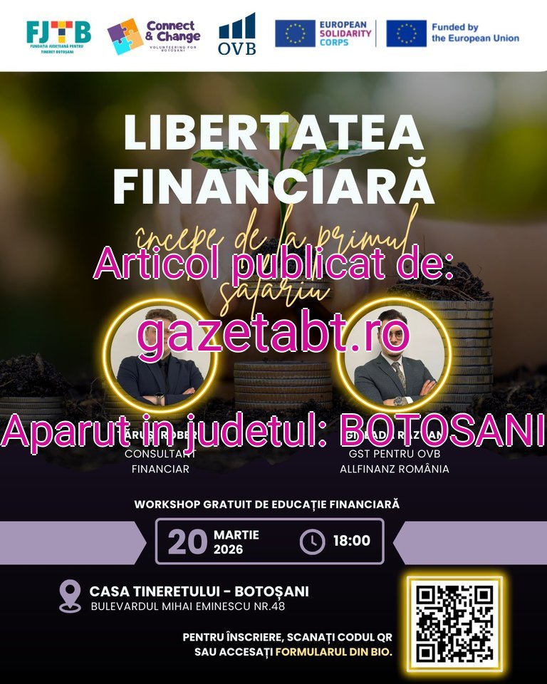 Evenimentul, intitulat „Libertatea financiară începe de la primul salariu”, va avea loc pe data de 20 martie 2026, începând cu ora 18:00, la Casa Tineretului Botoșani (Bulevardul Mihai Eminescu nr. 48).